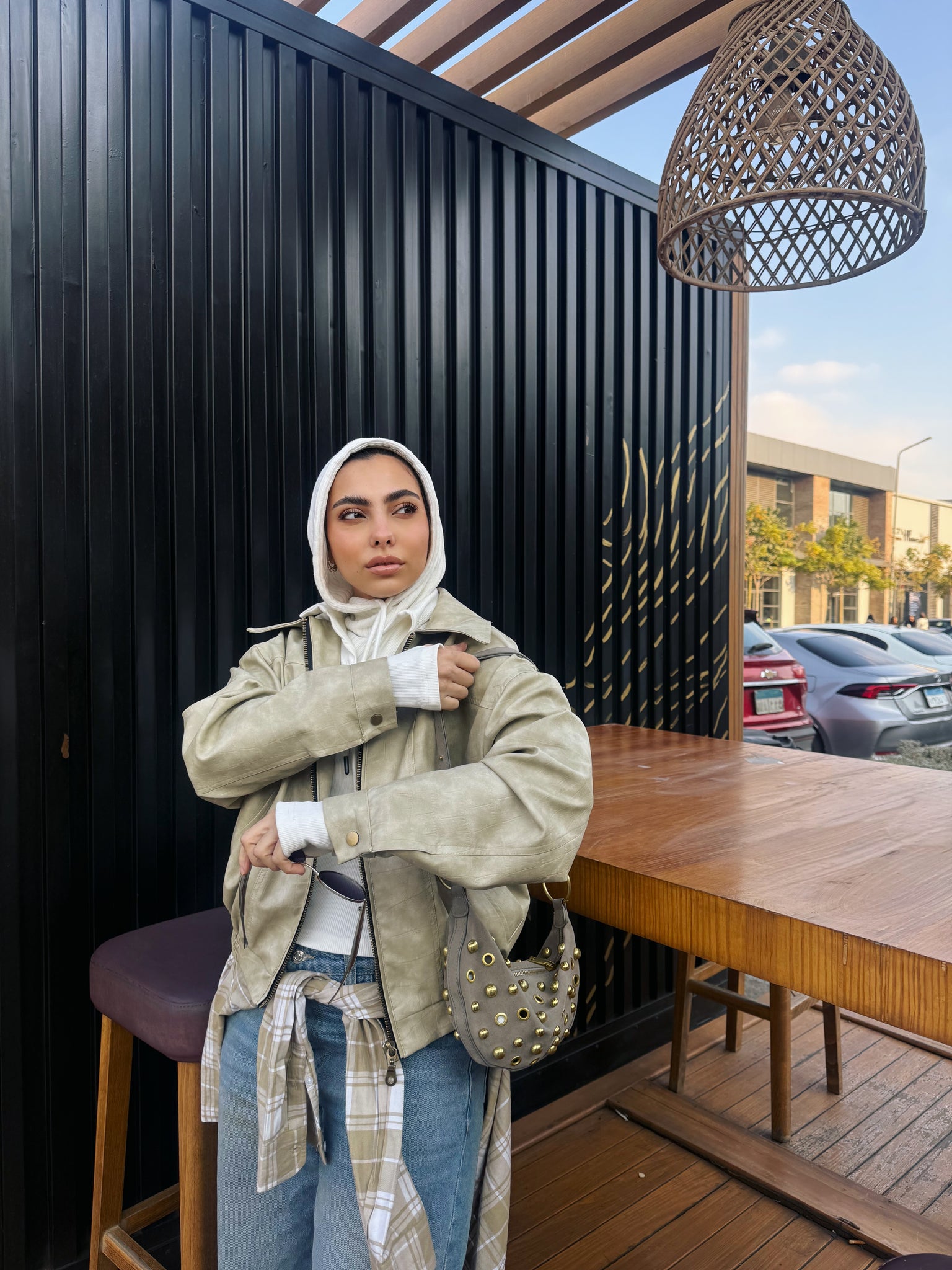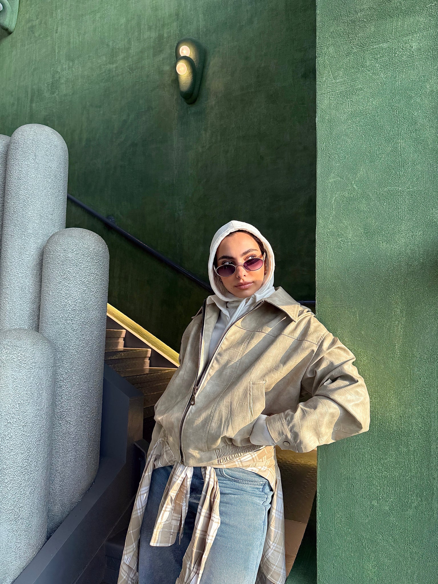 The jacket is designed with a relaxed, slightly oversized fit and a soft, textured fabric that adds both comfort and modern appeal. A classic collar, full front zipper, and subtle elasticized hem create a structured yet laid-back silhouette, ideal for layering.