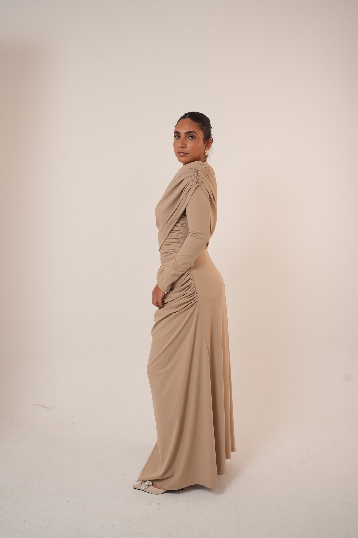 The asymmetrical draping adds a flattering silhouette while maintaining a modest and sophisticated look.