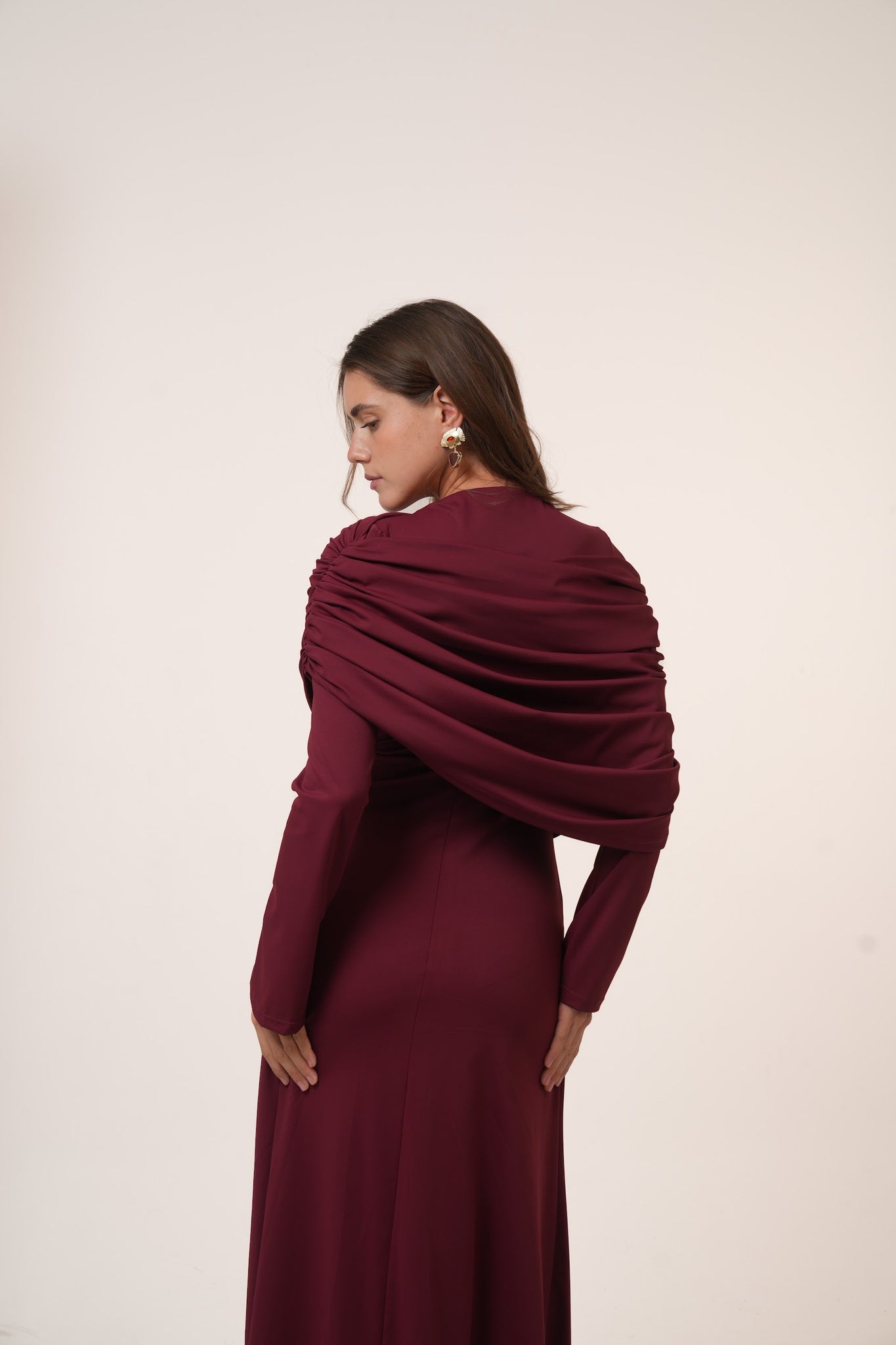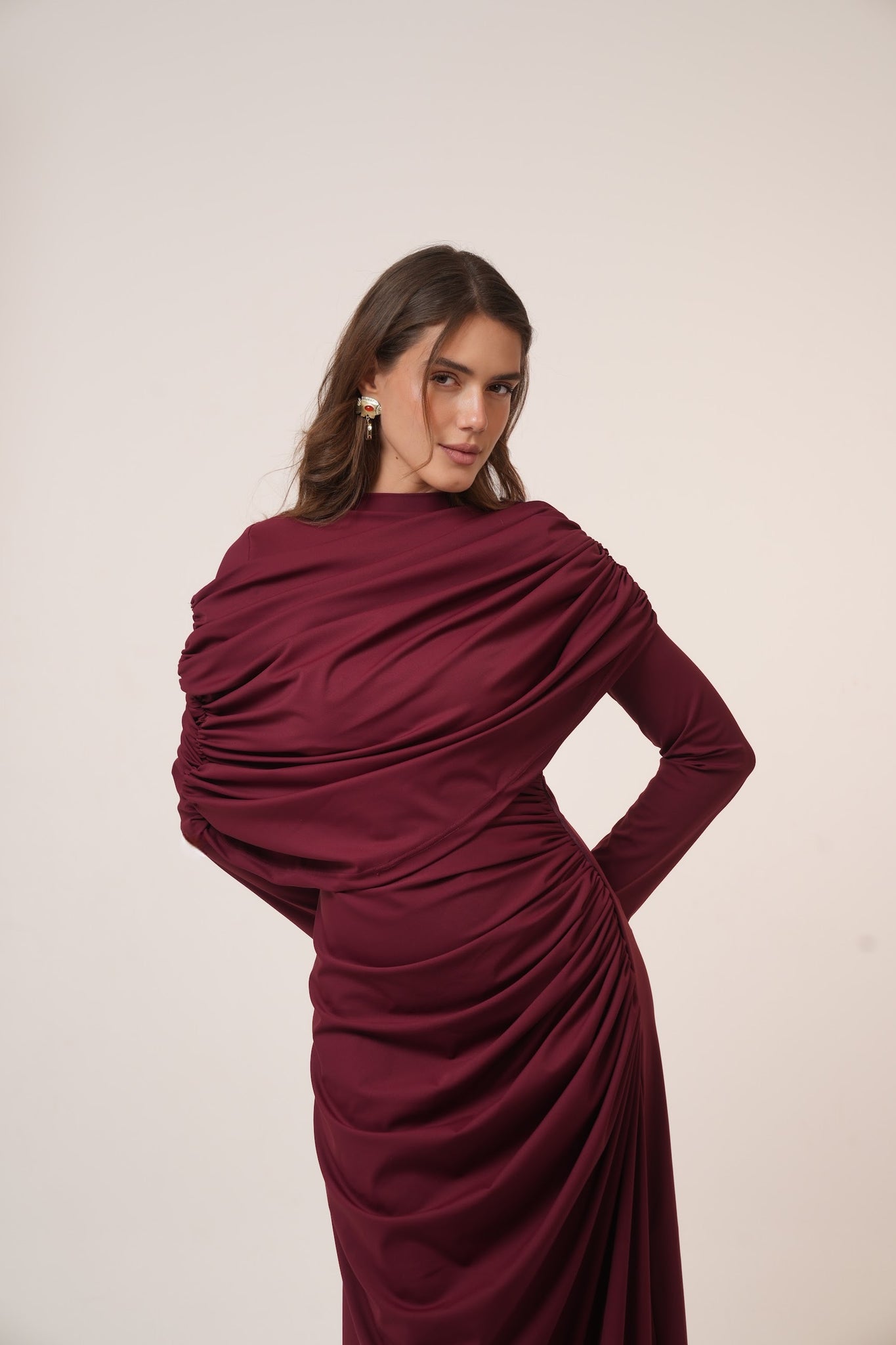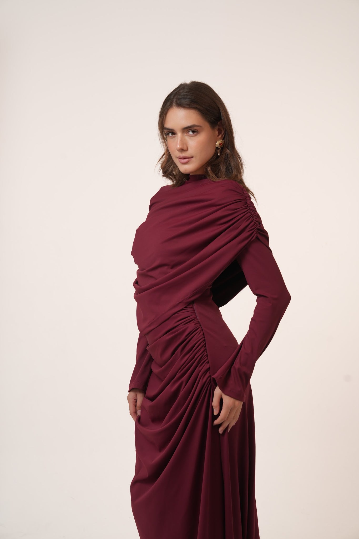 The asymmetrical draping adds a flattering silhouette while maintaining a modest and sophisticated look.