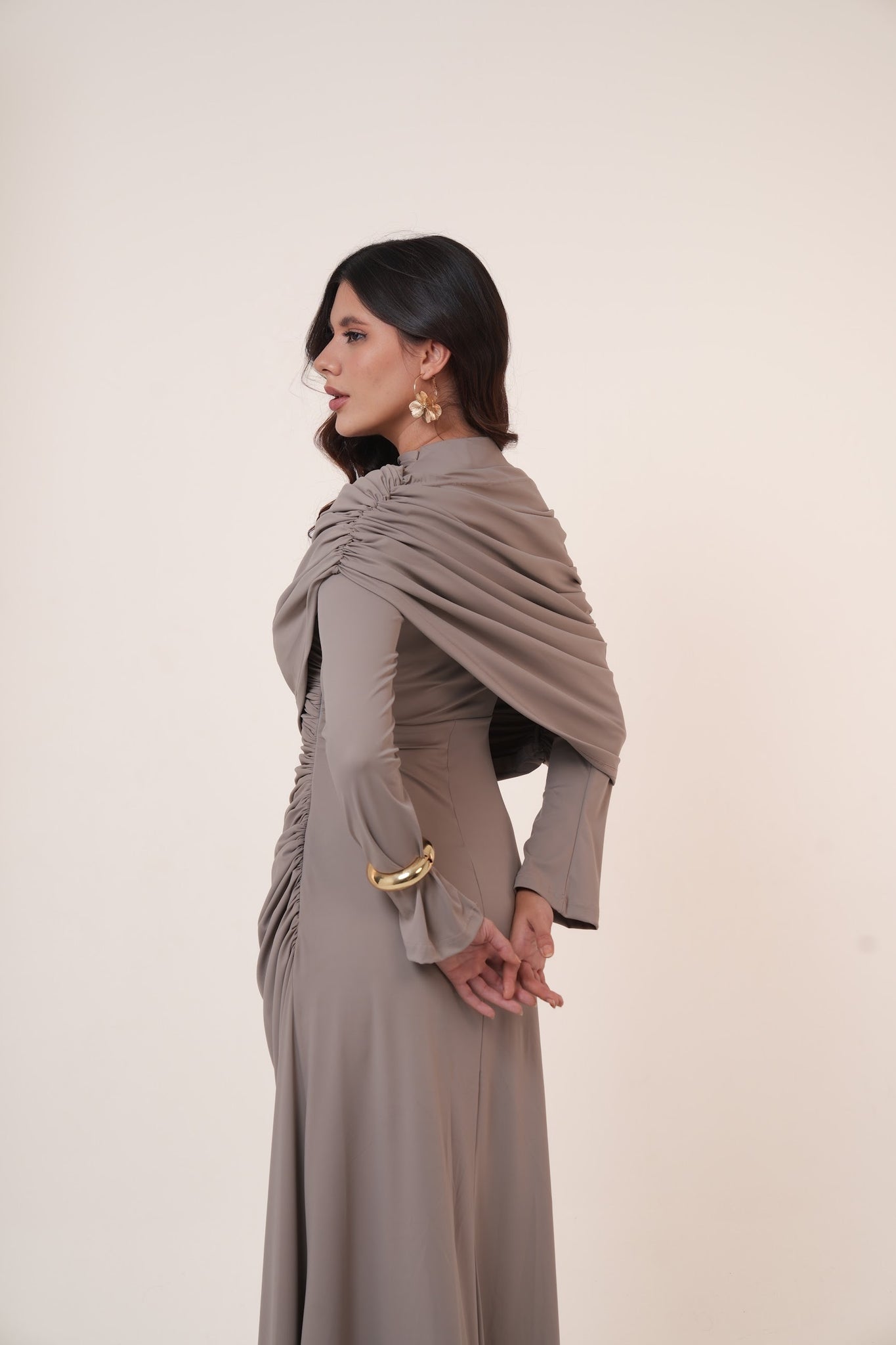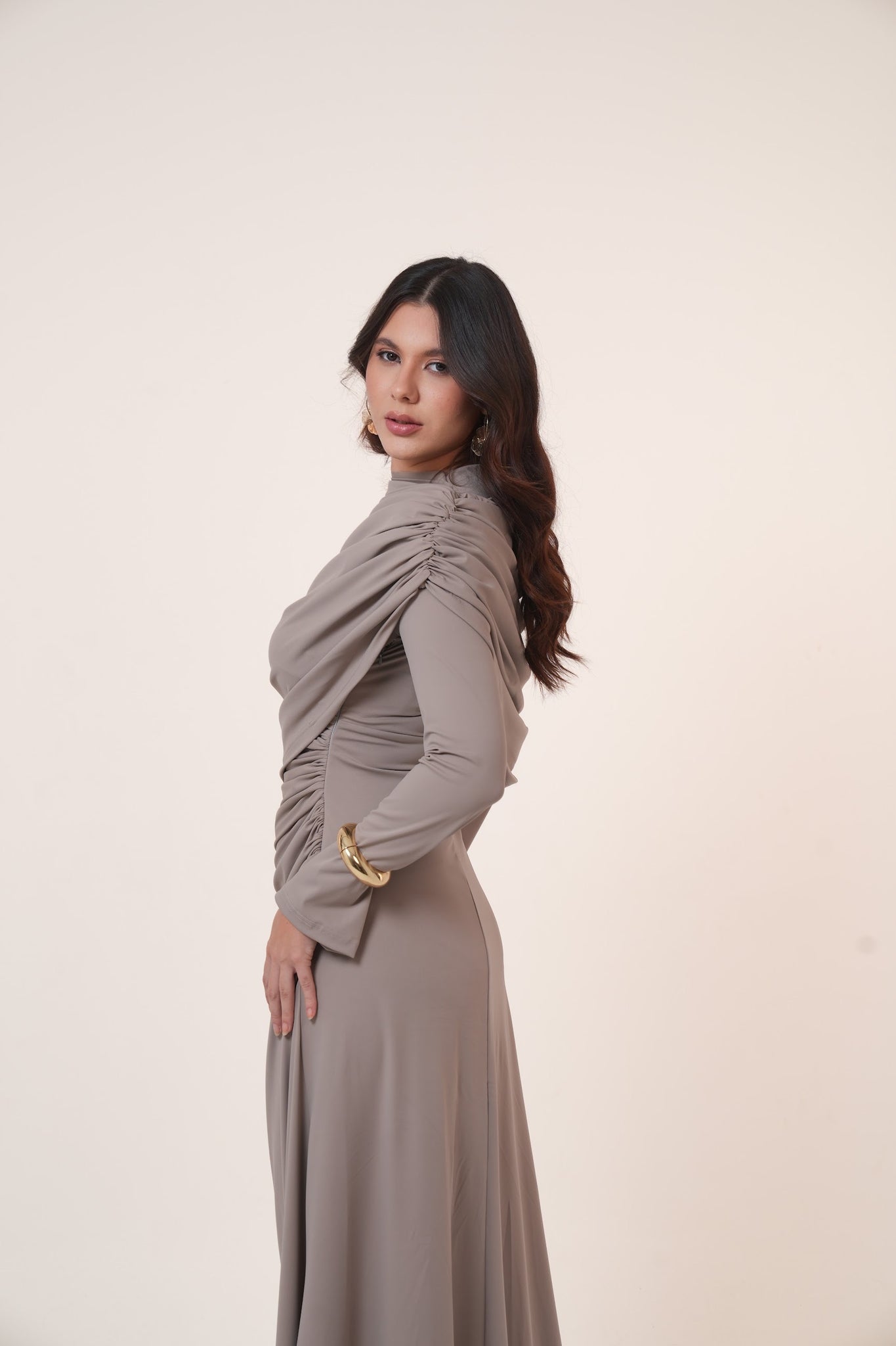 The asymmetrical draping adds a flattering silhouette while maintaining a modest and sophisticated look.