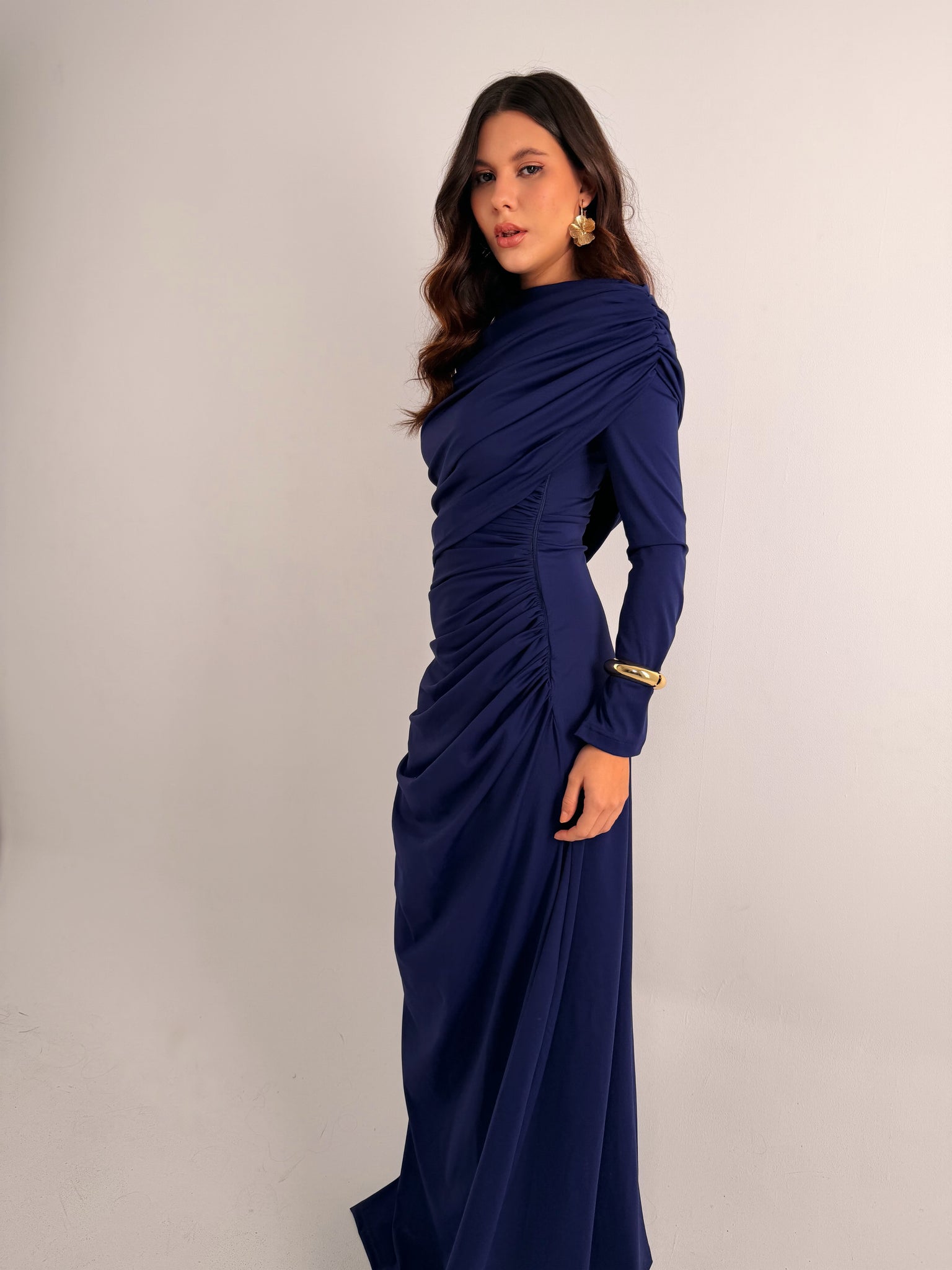 An elegant one-side draped maxi dress designed with a built-in chest cover for full, confident coverage.