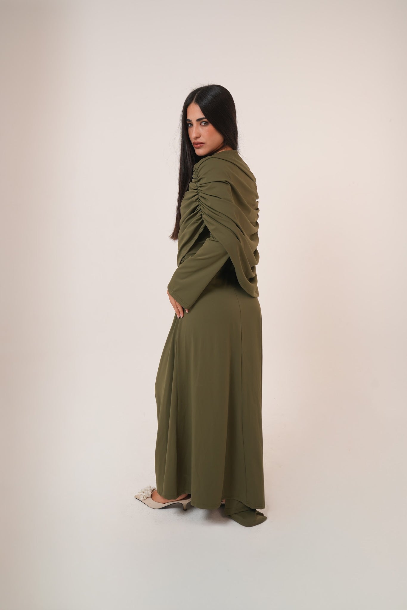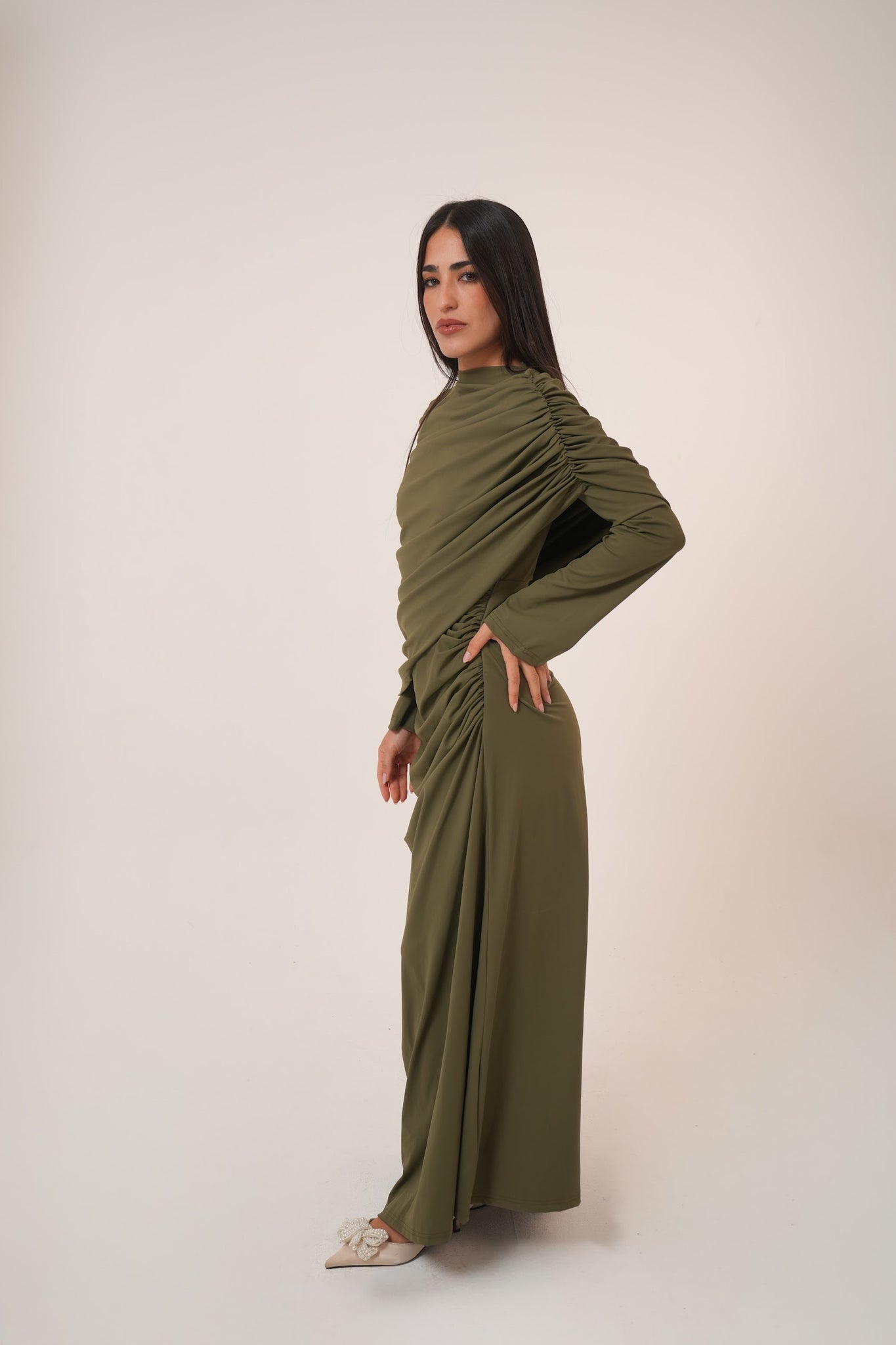 The asymmetrical draping adds a flattering silhouette while maintaining a modest and sophisticated look.