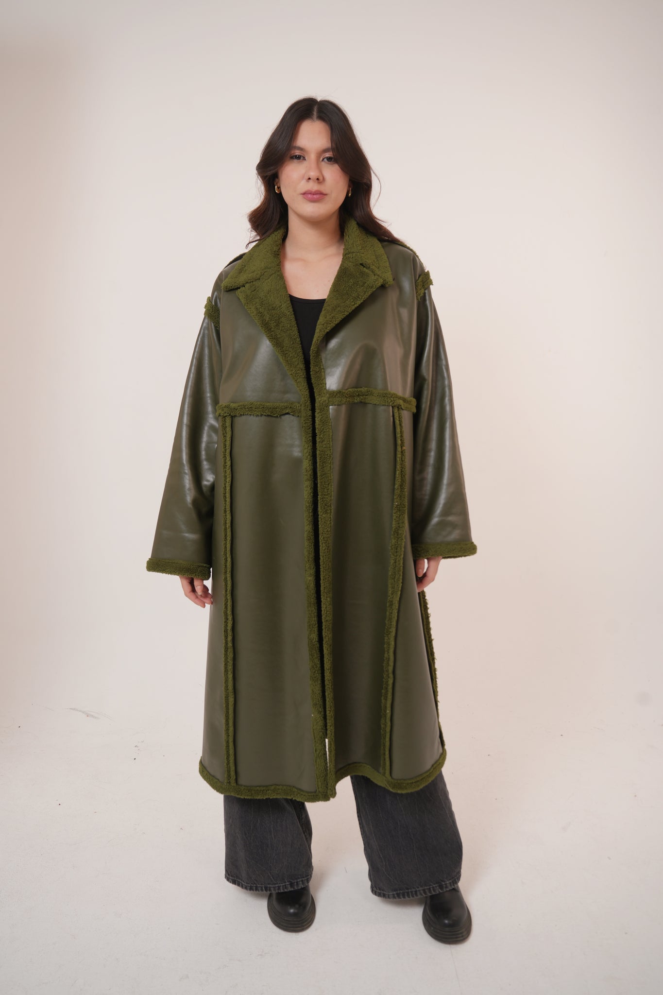 Crafted from high-quality faux leather and fully lined with plush shearling, this long coat offers exceptional insulation while maintaining a sleek, structured silhouette.