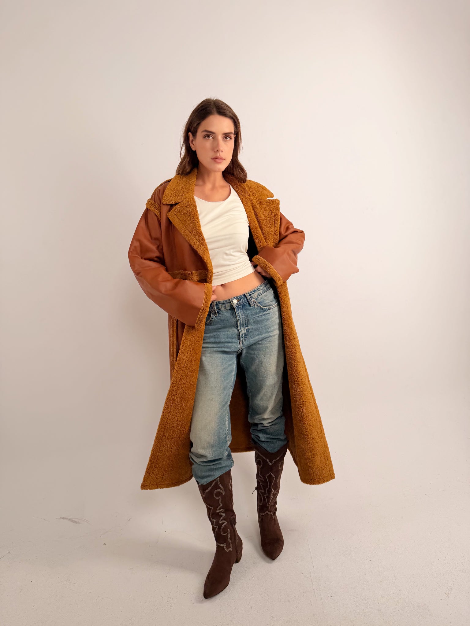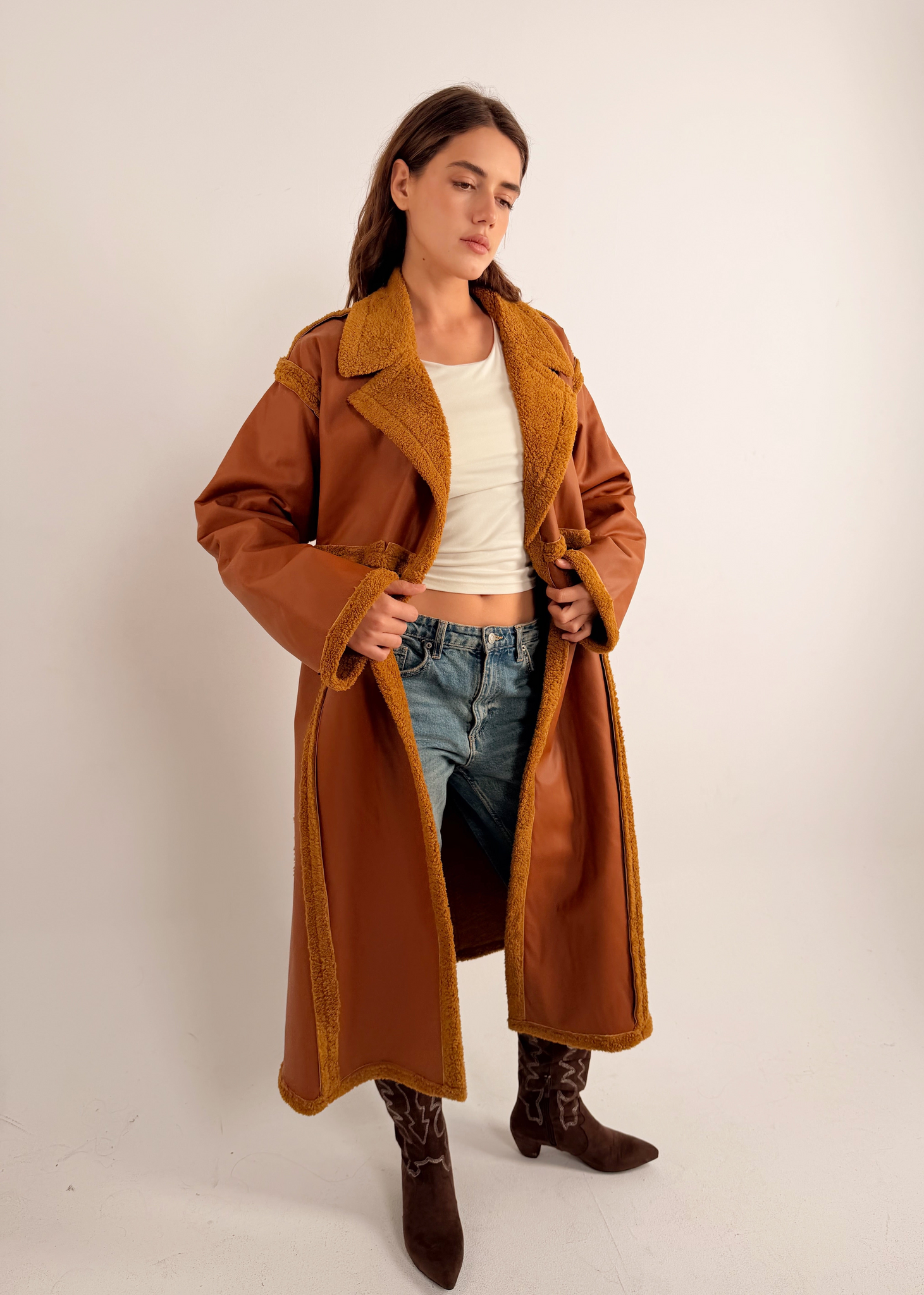 Crafted from high-quality faux leather and fully lined with plush shearling, this long coat offers exceptional insulation while maintaining a sleek, structured silhouette.