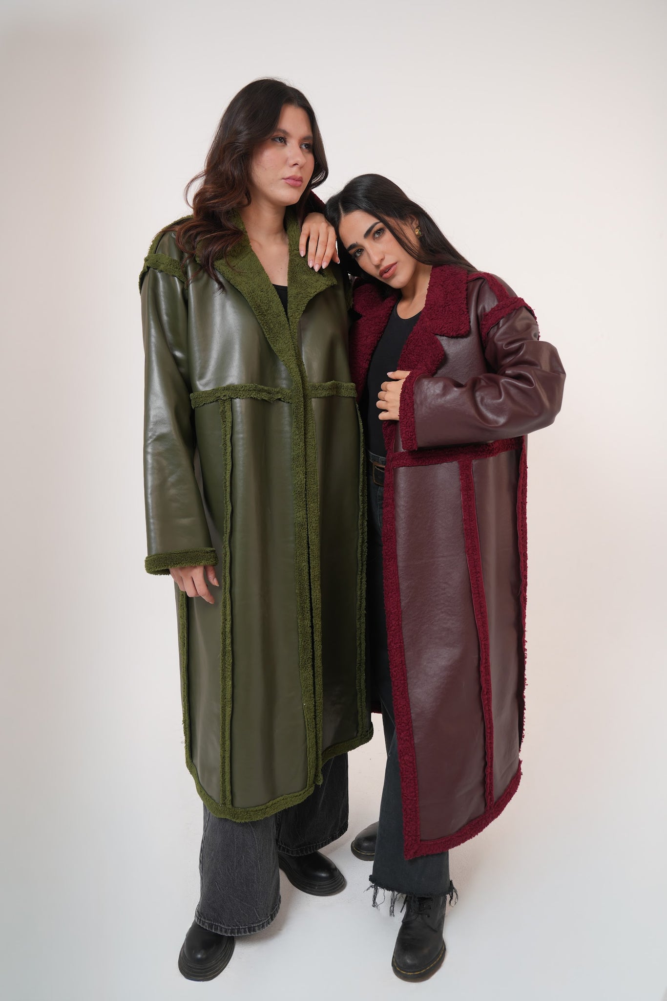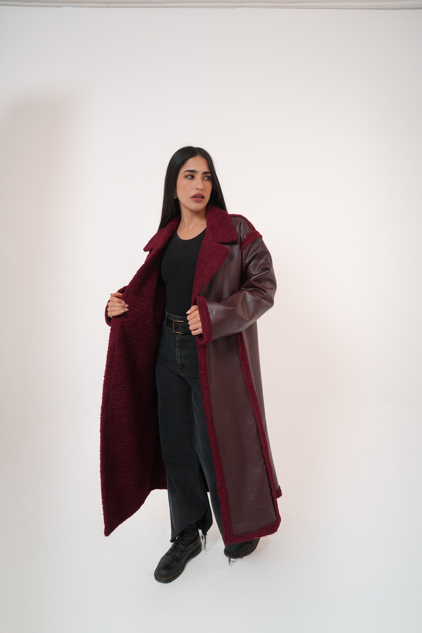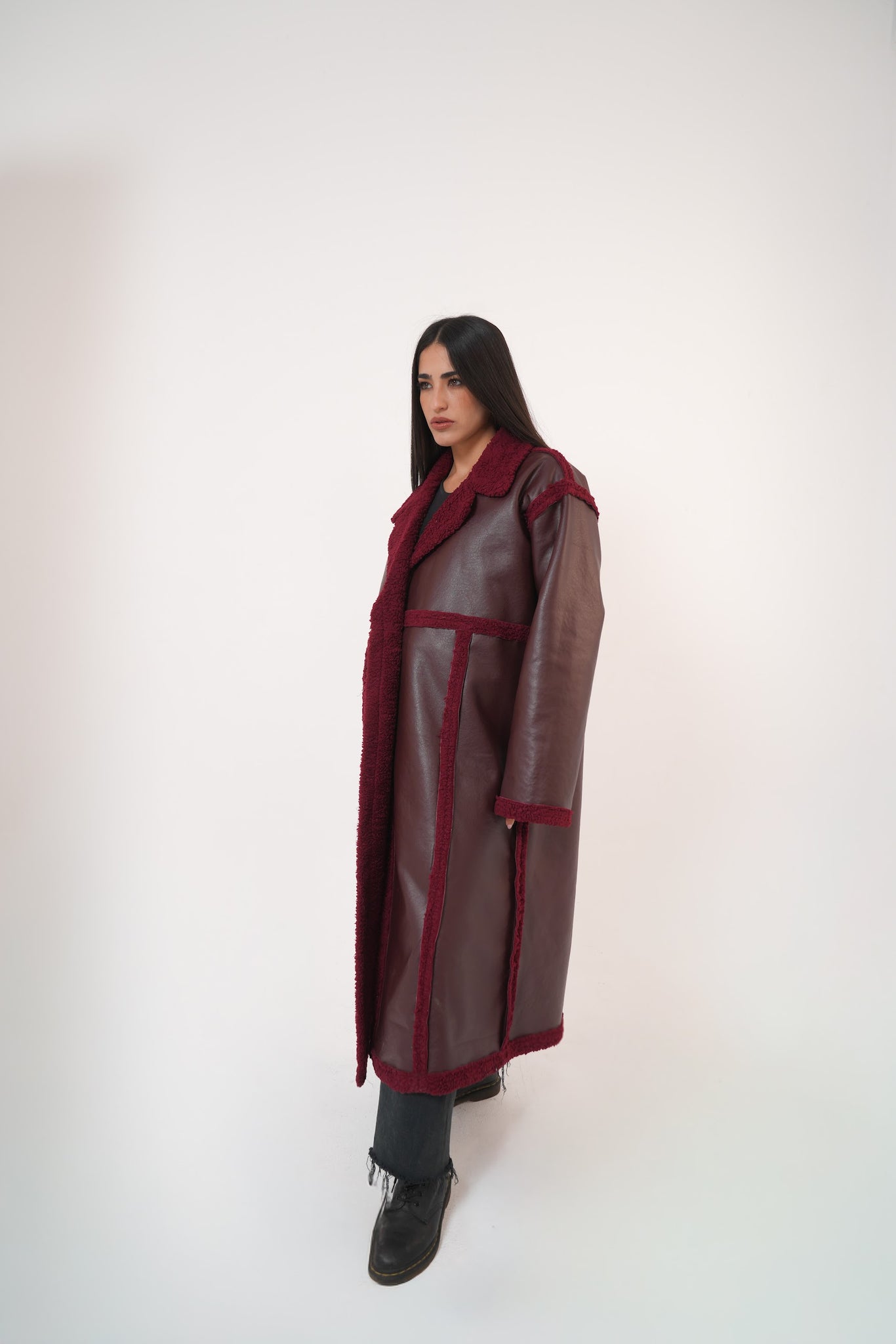 Crafted from high-quality faux leather and fully lined with plush shearling, this long coat offers exceptional insulation while maintaining a sleek, structured silhouette.