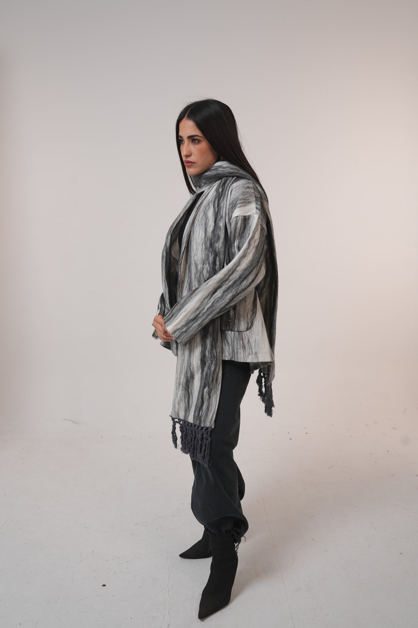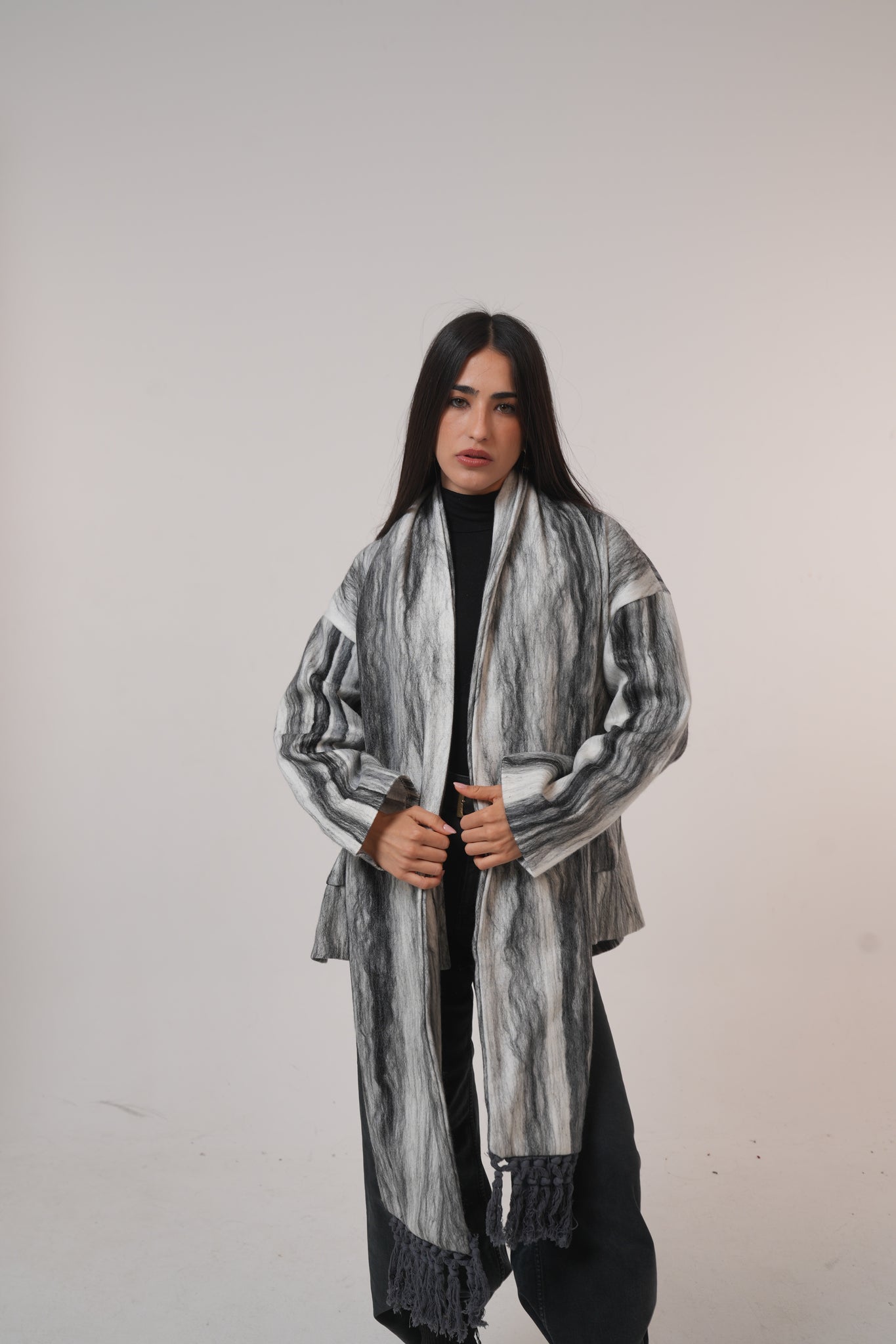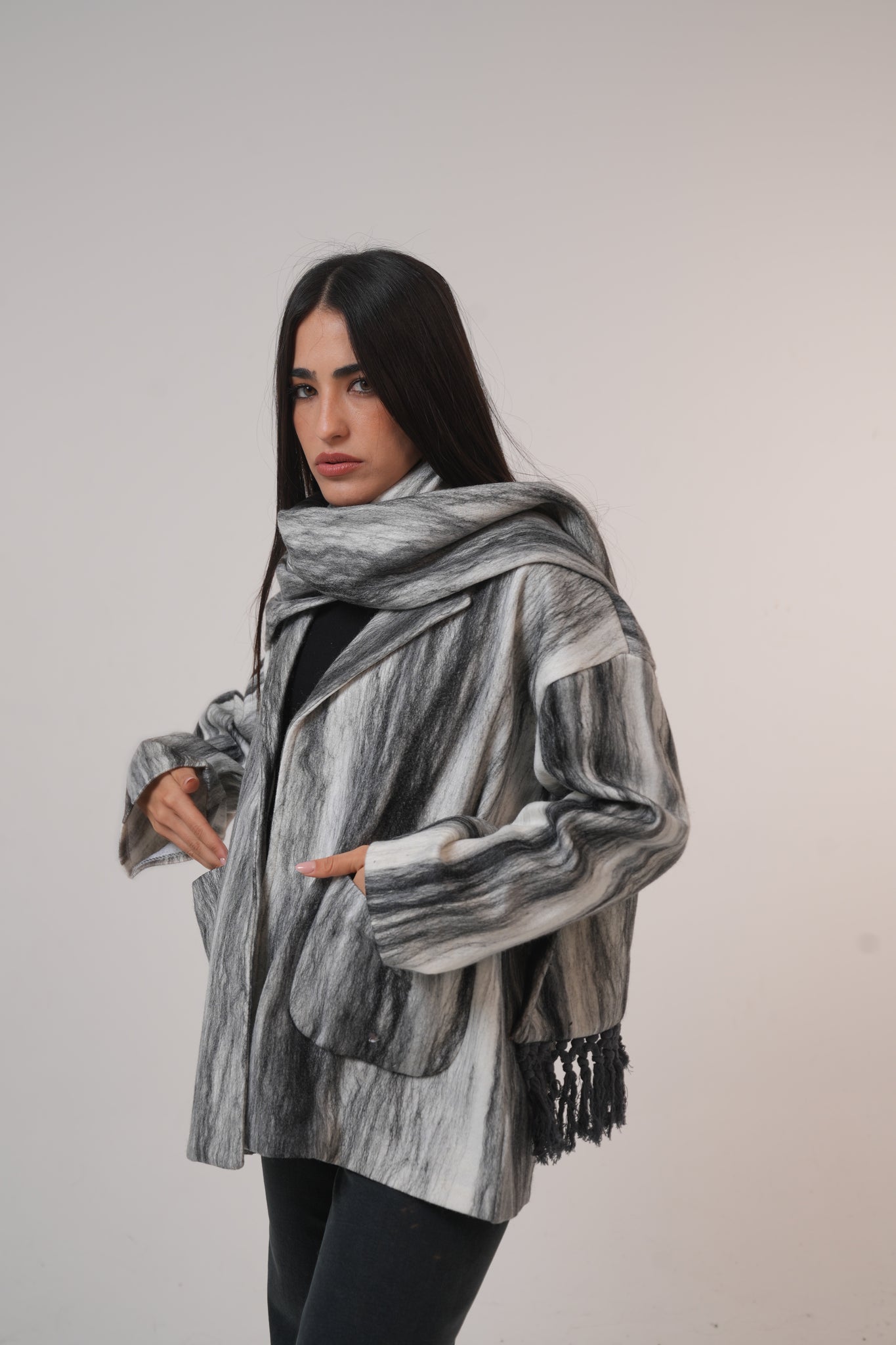This pure wool jacket features a cozy shawl collar for added elegance and warmth. Crafted from 100% premium wool, it offers a soft feel and lasting durability, making it perfect for cooler weather. Its tailored fit combines comfort with a refined, timeless style