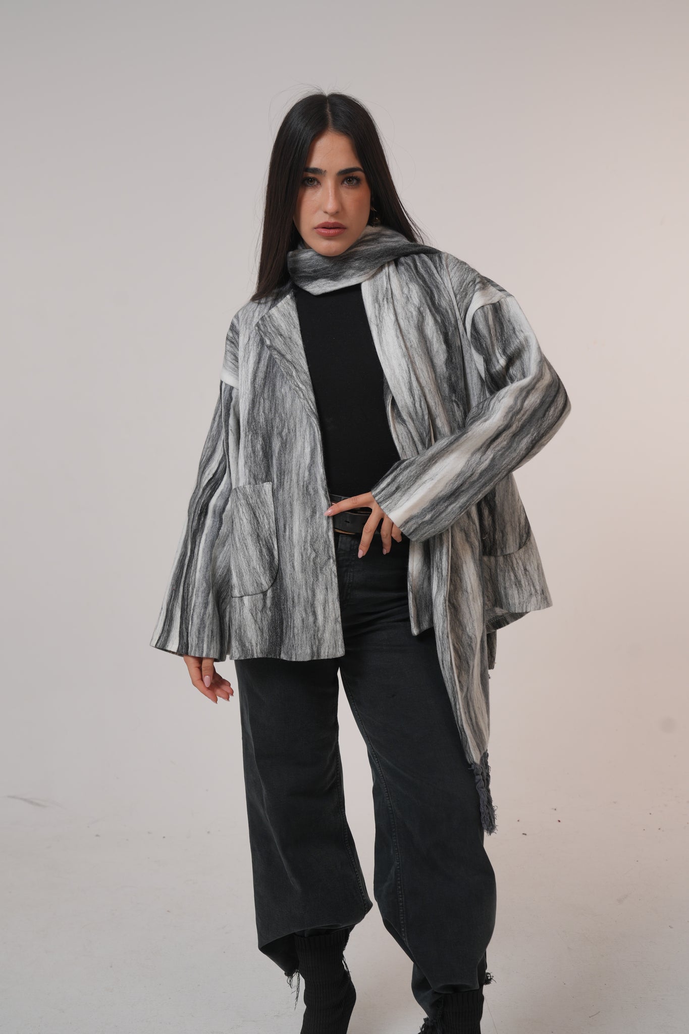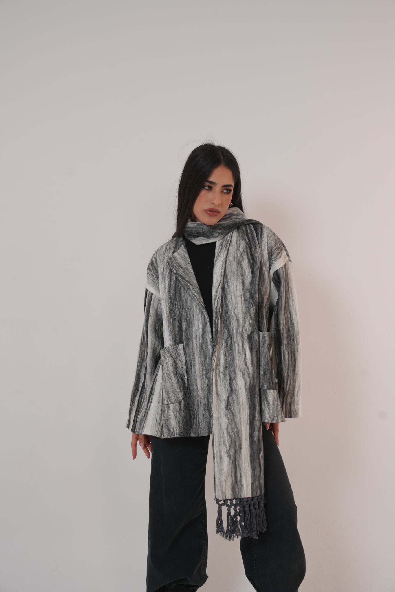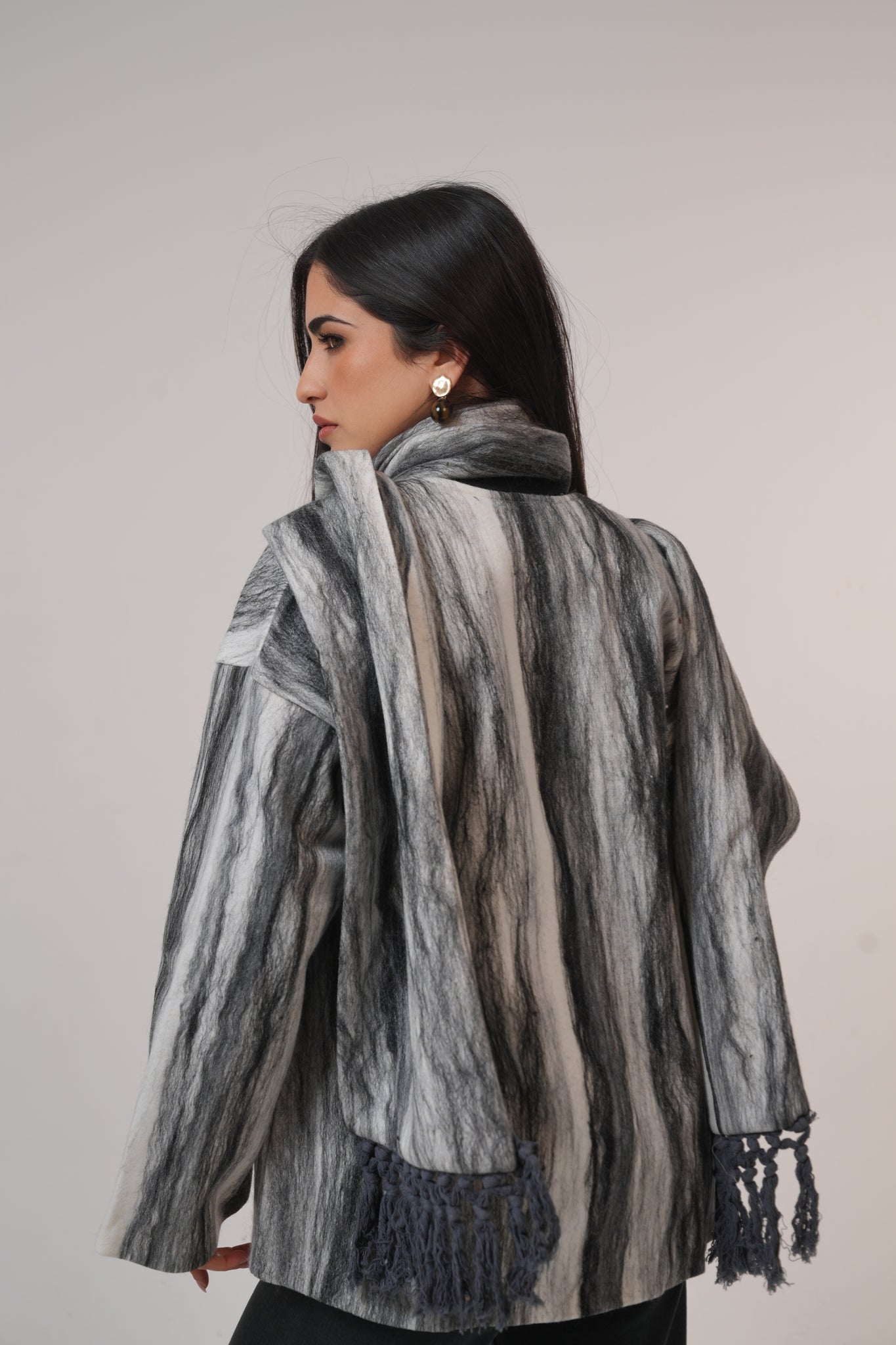 This pure wool jacket features a cozy shawl collar for added elegance and warmth. Crafted from 100% premium wool, it offers a soft feel and lasting durability, making it perfect for cooler weather. Its tailored fit combines comfort with a refined, timeless style