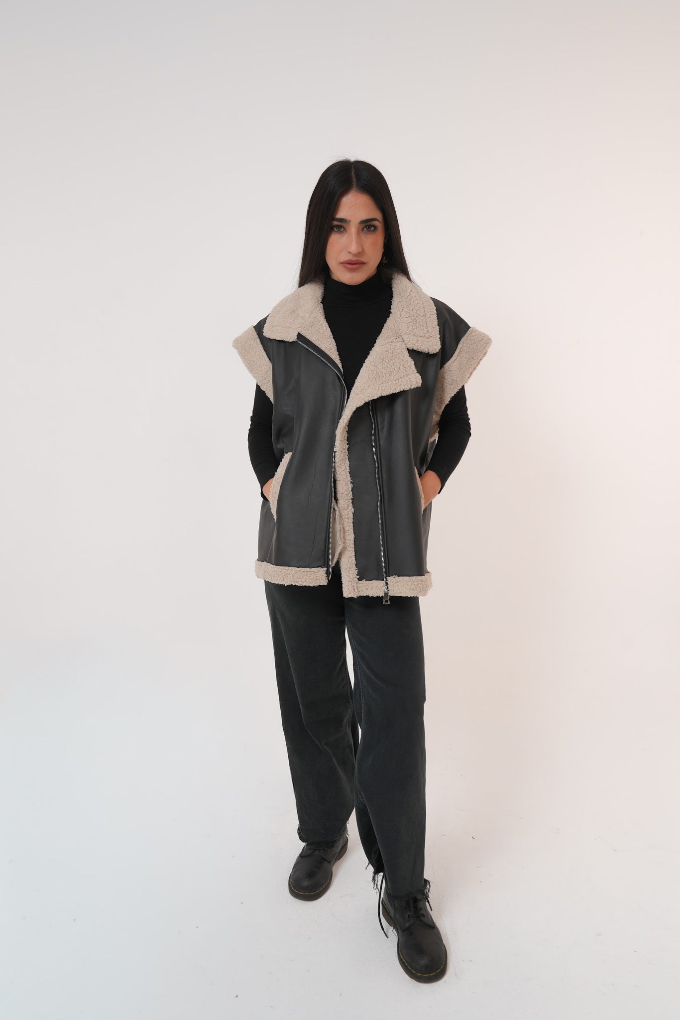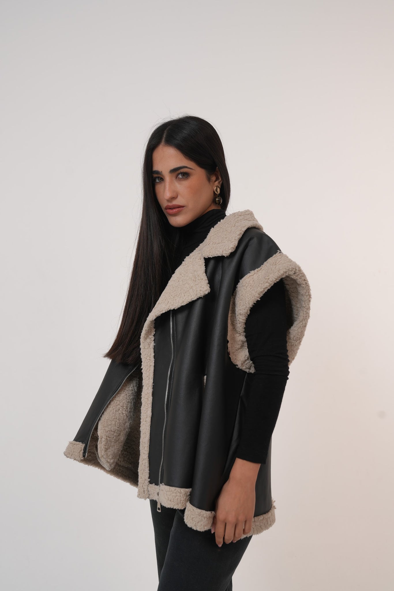 A premium Leather Fur Vest crafted from high-quality faux leather and lined with ultra-soft shearling for extra warmth and comfort. Designed with oversized lapels, clean finishing, and a relaxed fit, making it the perfect winter layering piece for everyday chic looks.